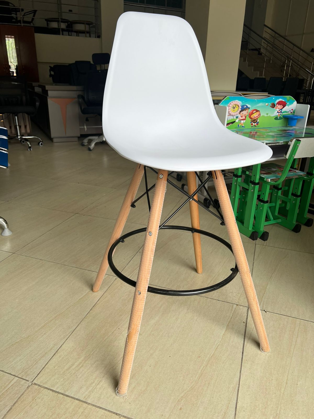 Description Modern bar stool with molded seat and wood-look legs—perfect for breakfast bars and cafés. Stool Features - Seat: Ergonomic PP shell in matte white; easy to clean. - Base: Wood-look legs with metal foot ring for support. - Stability: Cross-brace under-seat structure. Dimensions (Approx.) - Seat Height: 72–75 cm; Overall H 100–105 cm. Use & Care - Indoor use; wipe with mild soap and water.