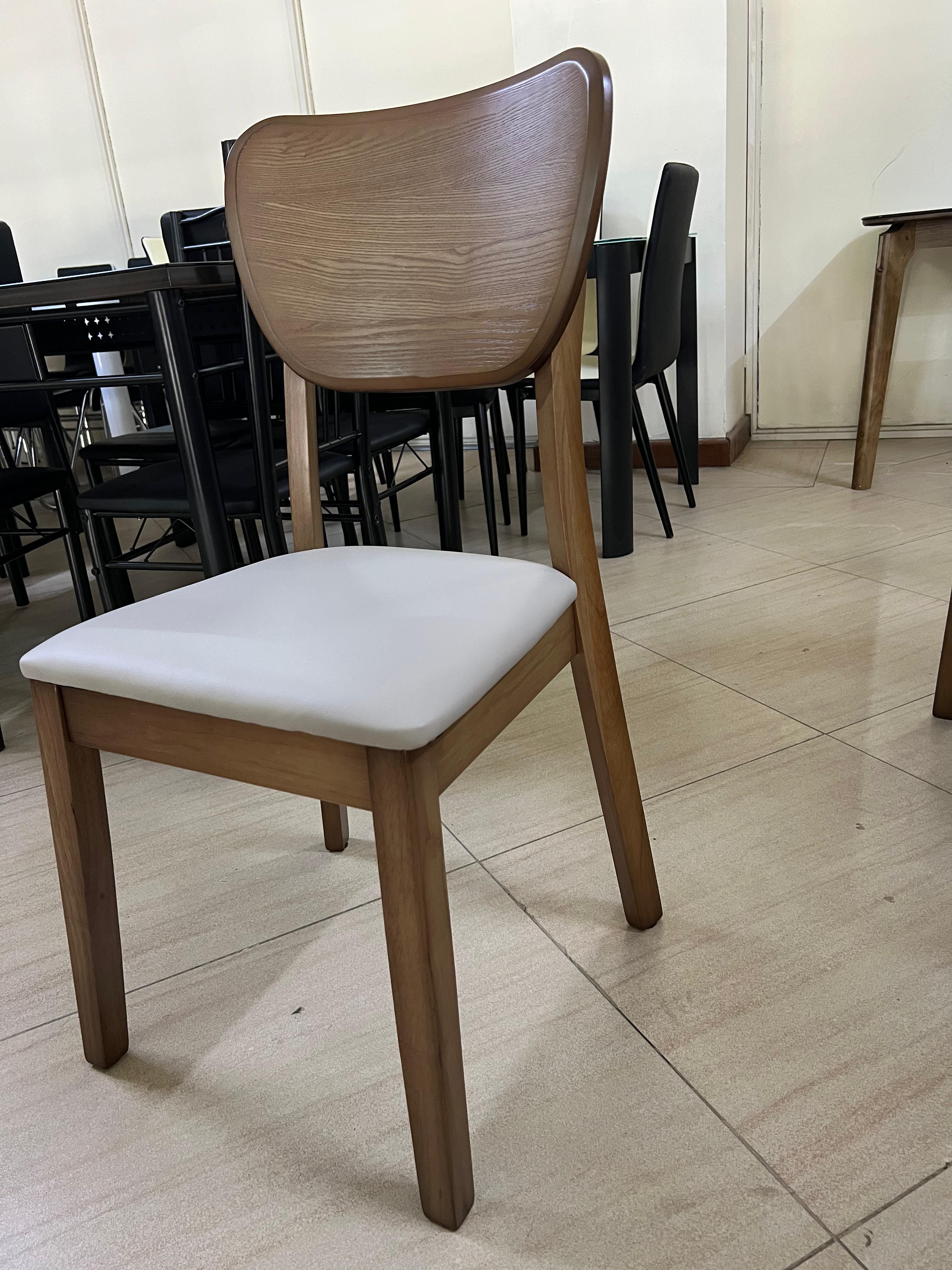 Description Contemporary dining chair with a natural wood-grain backrest,