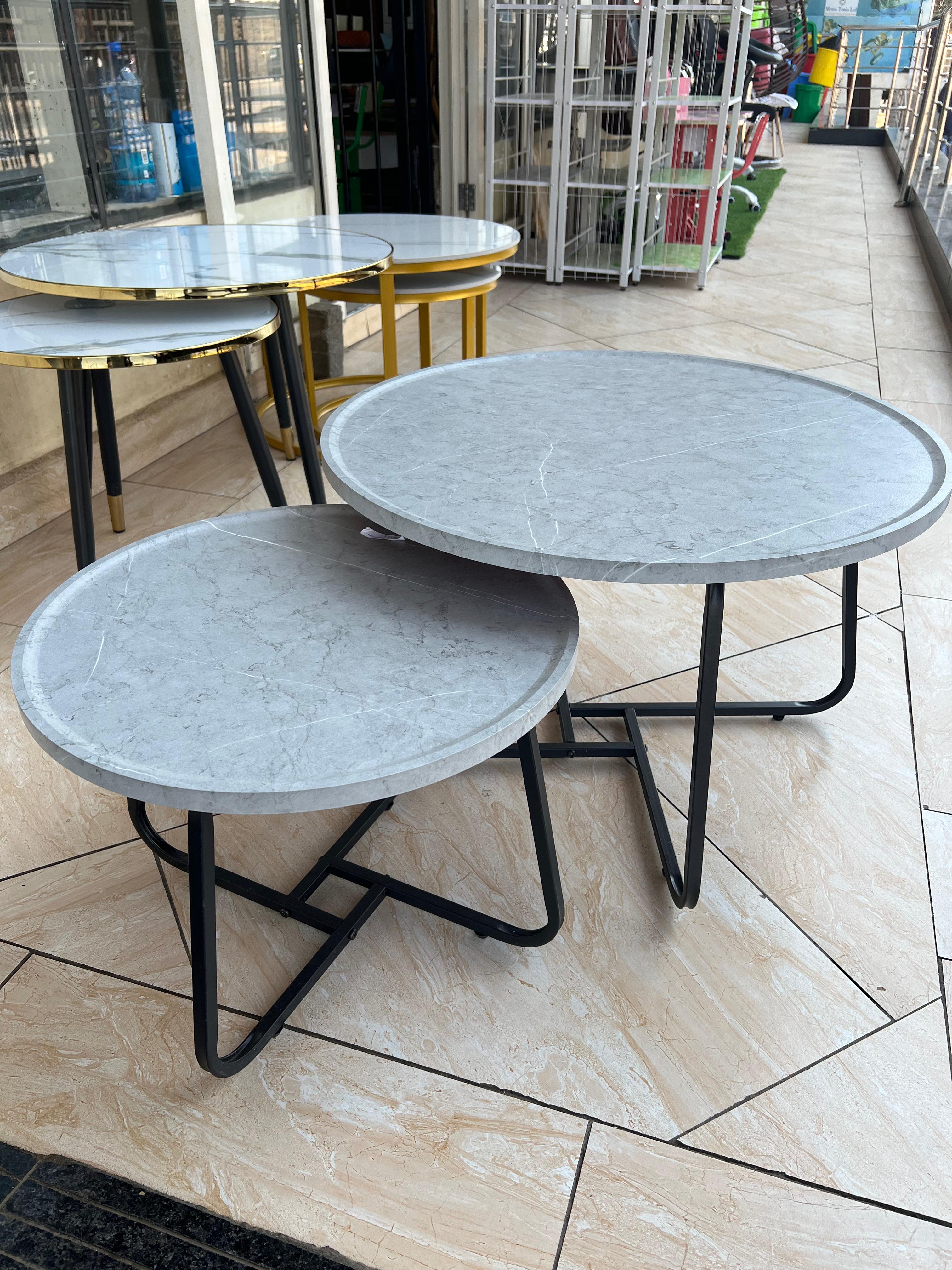 Description 2-piece round nesting coffee tables with grey marble-look tops