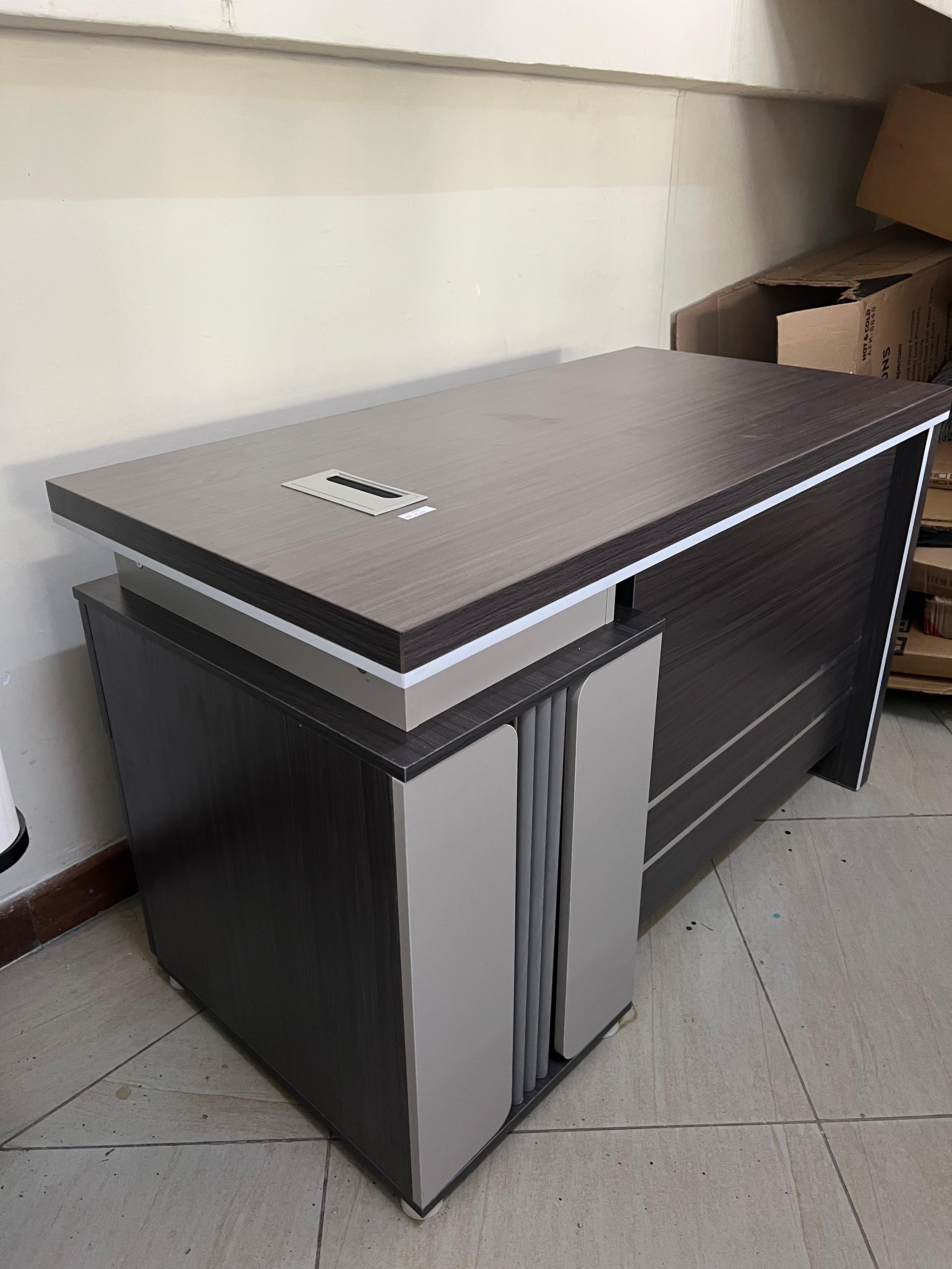 Executive desk with deep wood grain top, contrasting trims, integrated side